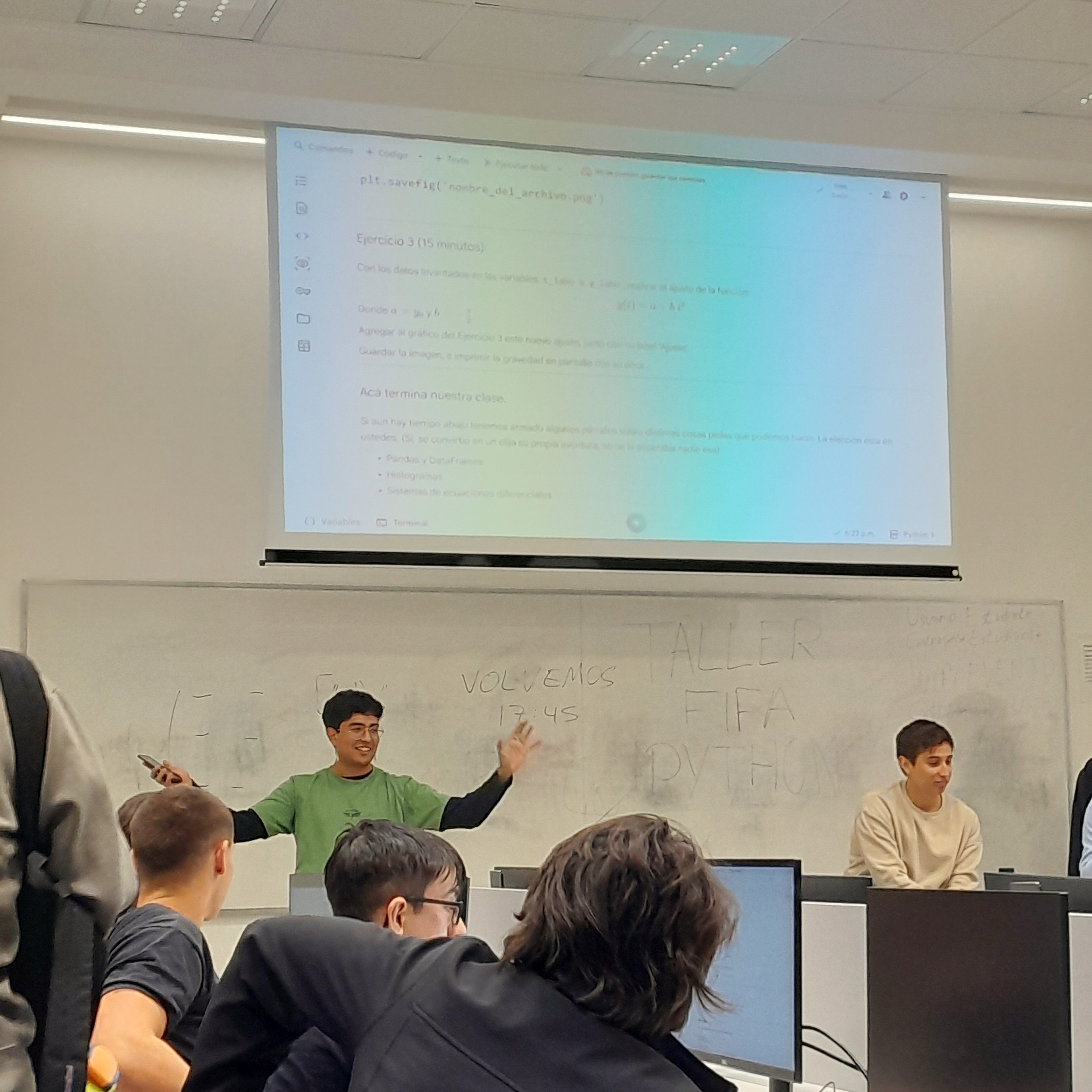El taller suele ser una vez por cuatri, según la demanda y la disponibilidad docente. Apunta a cubrir las herramientas necesarias para encarar las materias de física (particularmente los laboratorios), y está abierto a todes. Consiste en tres clases de 3½ hs cada una, donde arrancamos desde cero y terminamos aplicando herramientas de análisis de datos en Python para resolver problemas de Física, Biología, y Estadística.